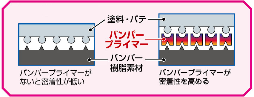 樹脂バンパーはもともとパテやペイントが密着しにくい素材(PP)なので、密着力を高める必要があります。本品を使用することで密着性を高めることができます。