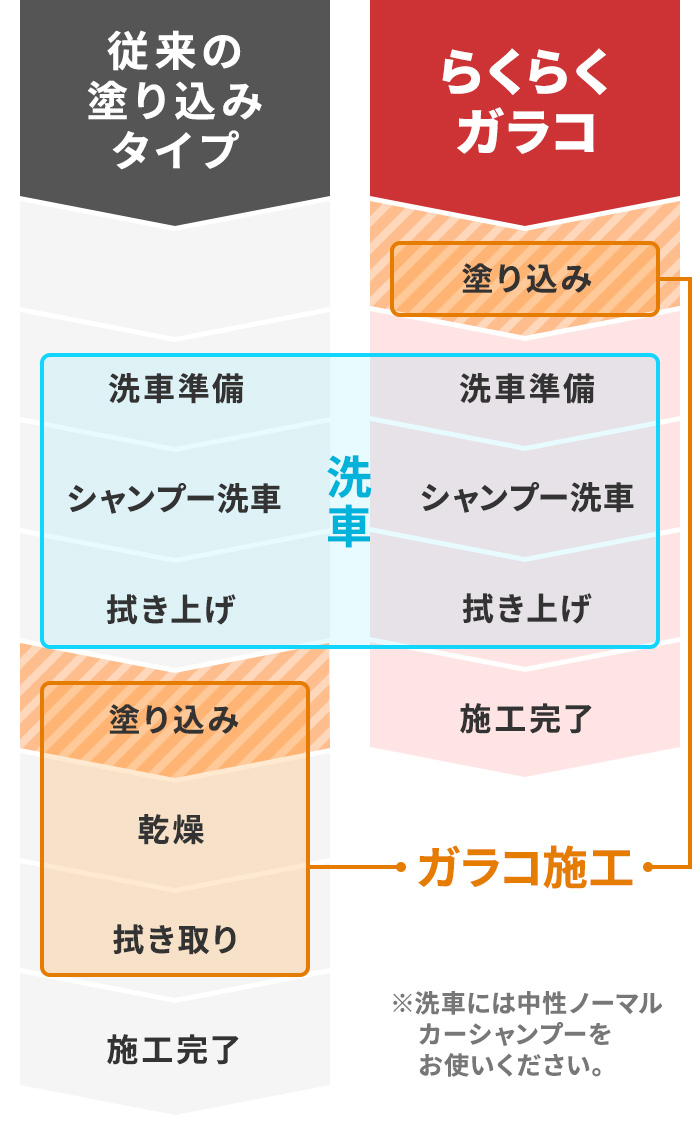 らくらくガラコは洗車の準備時間で乾燥するから実質待ち時間はゼロ。また、拭き取り工程が不要になるので施工ムラが激減する上、洗車により余剰成分が残らずギラつきのないクリアな仕上がりとなります。