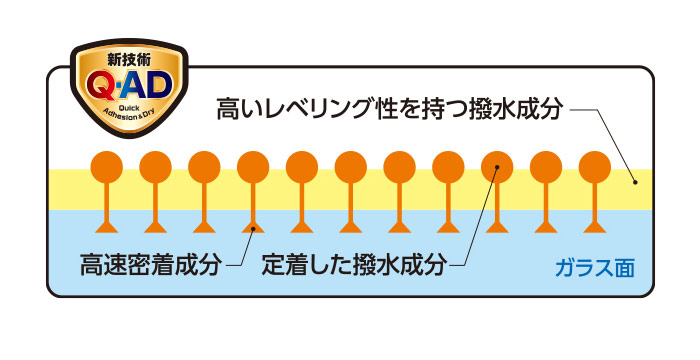 高密着成分(QA)で撥水成分が瞬時に洗車可能なレベルに定着。高いレベリング性で速乾性(QD)と均一な仕上がりを両立。