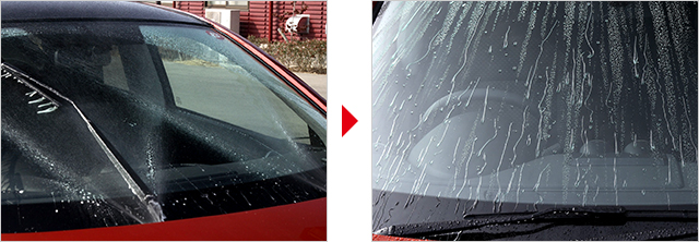 液を噴射し、ワイパーを数回動かしてガラス面の汚れを落としてください。撥水コーティングも同時に完了します。