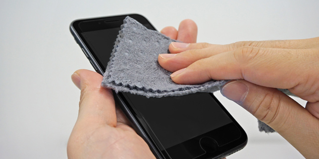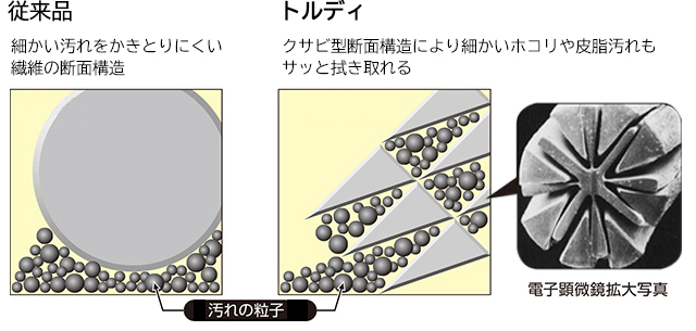 特殊クサビ型断面構造の超極細繊維が、指紋や皮脂汚れなどの落ちにくい汚れをサッとひと拭きで、かき取ります。