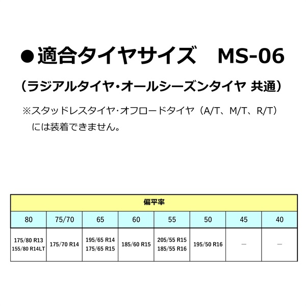 ●タイヤサイズに適合した品番であることをご確認ください。また、タイヤサイズが同じでもメーカーやブランドによって装着困難なケースがありますので、ご使用前に着脱練習も兼ねて必ずテスト装着を行ってください。