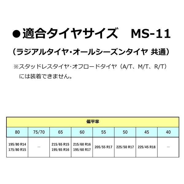 ●タイヤサイズに適合した品番であることをご確認ください。また、タイヤサイズが同じでもメーカーやブランドによって装着困難なケースがありますので、ご使用前に着脱練習も兼ねて必ずテスト装着を行ってください。