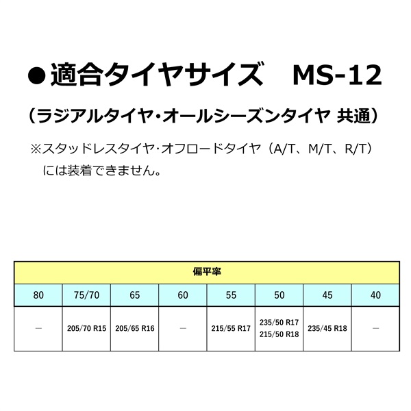 ●タイヤサイズに適合した品番であることをご確認ください。また、タイヤサイズが同じでもメーカーやブランドによって装着困難なケースがありますので、ご使用前に着脱練習も兼ねて必ずテスト装着を行ってください。