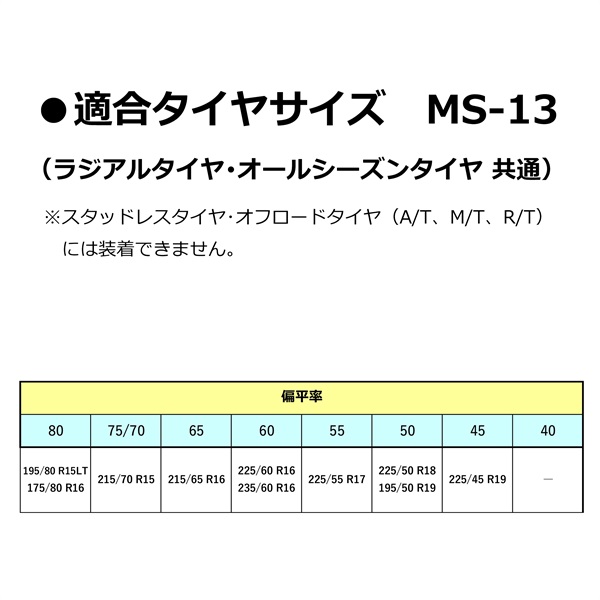 ●タイヤサイズに適合した品番であることをご確認ください。また、タイヤサイズが同じでもメーカーやブランドによって装着困難なケースがありますので、ご使用前に着脱練習も兼ねて必ずテスト装着を行ってください。