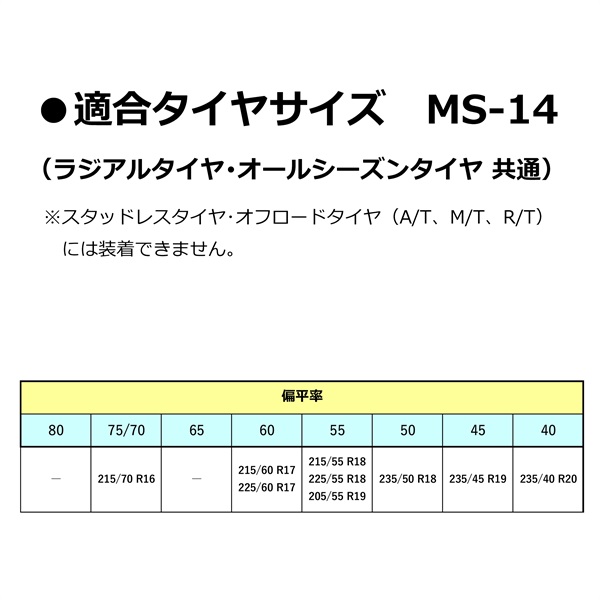 ●タイヤサイズに適合した品番であることをご確認ください。また、タイヤサイズが同じでもメーカーやブランドによって装着困難なケースがありますので、ご使用前に着脱練習も兼ねて必ずテスト装着を行ってください。