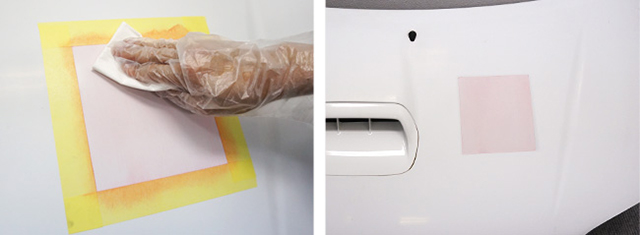 今回の実験では、塗り込む部分の効果が分かるようにマスキングをして、作業スタートです。