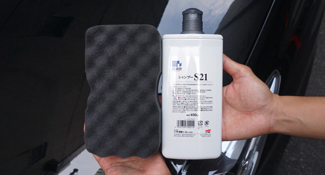 こちらもシリーズ商品『洗車研 シャンプーS21』を使用。強力な洗浄効果と脱脂効果が特長の商品。汚れを除去するとともに、コーティング剤施工の障害となる油性の汚れを効率的に取り除くことができるシャンプーで、研究開発者が考える理想的なコーティング施工環境を作ることができます。