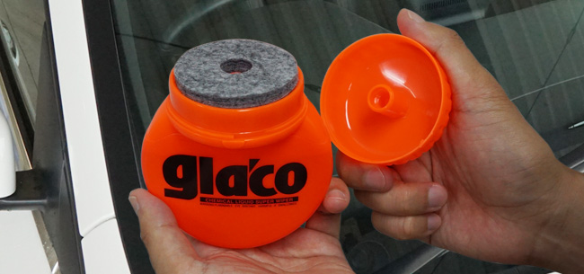 キャップをはずし、ガラスにフェルトを押し付け、ボトルを軽く握るようにして液剤を出しながら、隙間が無いようにガラス表面に塗り込んでいきます。