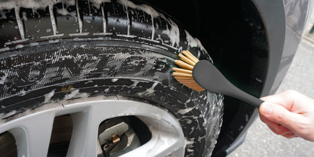 スポンジに比べてブラシの毛がタイヤ表面の細かな凹凸にも入ってくれるため、洗浄効果の期待が大きくなりますね。
