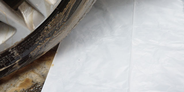 分かりやすいように白いシートを敷き、タイヤ専用のクリーナーを吹きかけて柄付きのブラシで洗浄したのがこちらです。軽くこすってみると、