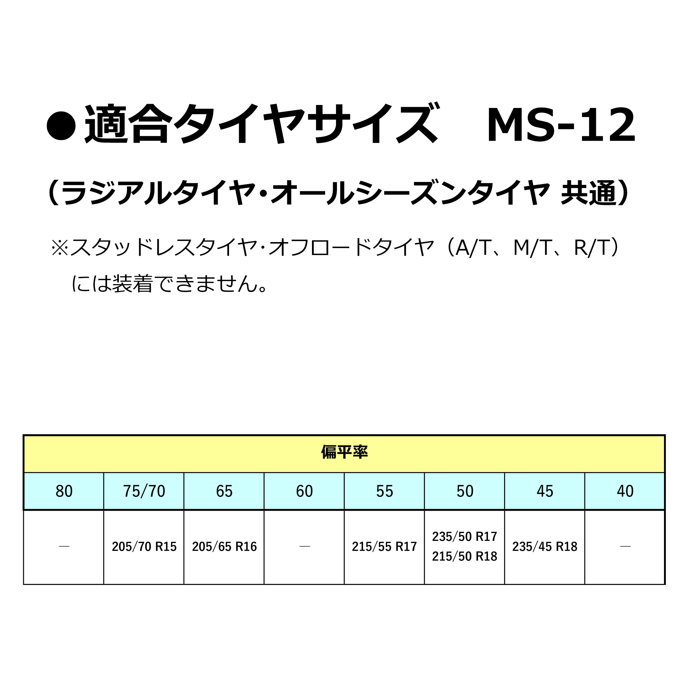 ●タイヤサイズに適合した品番であることをご確認ください。また、タイヤサイズが同じでもメーカーやブランドによって装着困難なケースがありますので、ご使用前に着脱練習も兼ねて必ずテスト装着を行ってください。