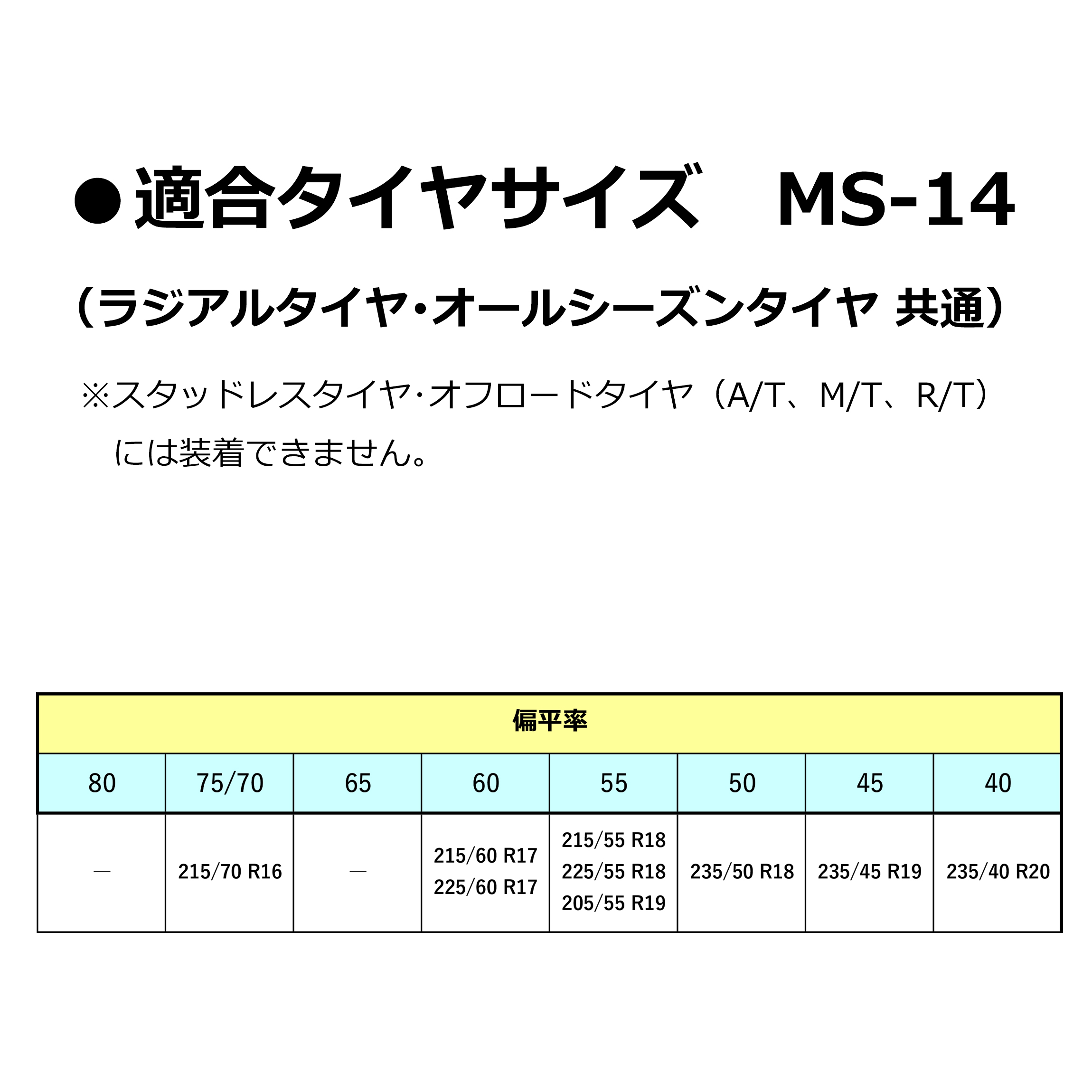 ※スタッドレスタイヤ・オフロードタイヤ(A/T、M/T、R/T)には装着できません。