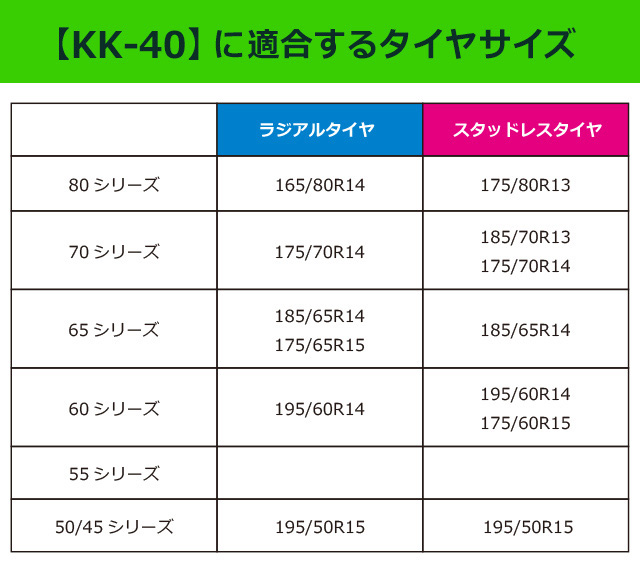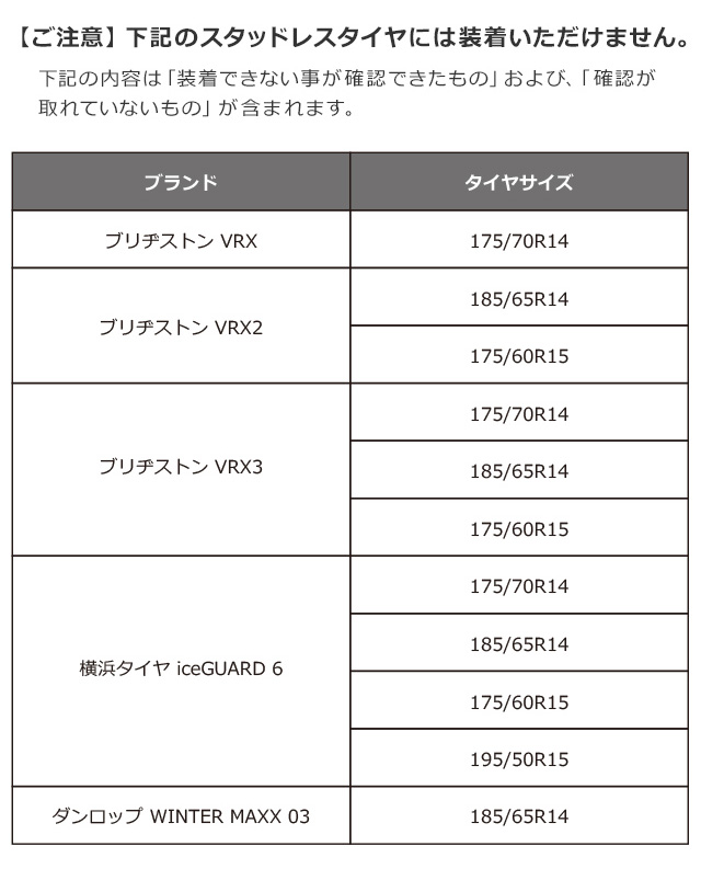※装着不可能車・装着不可能タイヤ と 走行注意車については、 こちら をご覧ください。